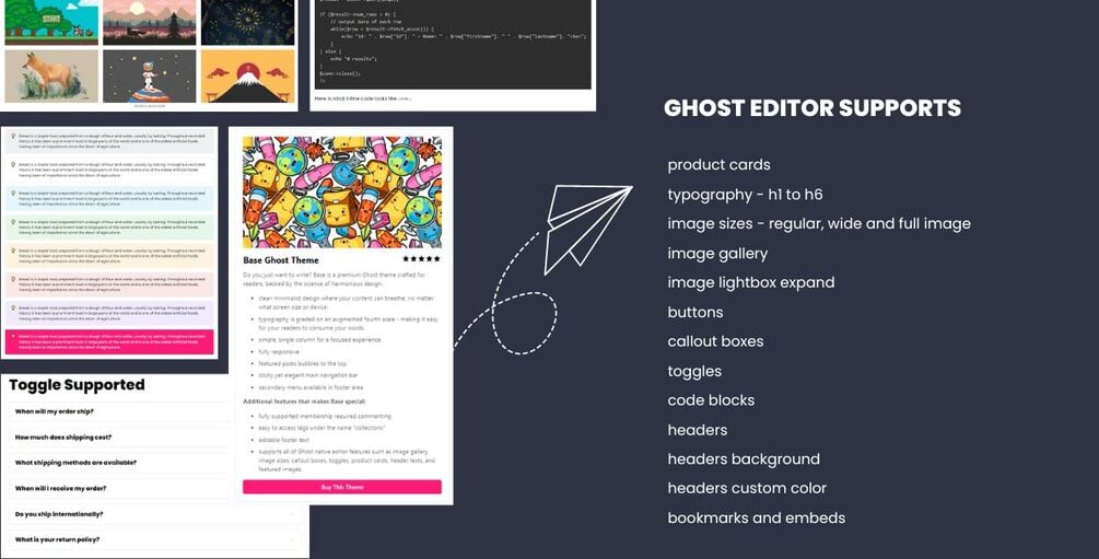 - supports all Ghost native editor features such as image gallery, image sizes, callout boxes, toggles, product cards, header texts, and featured images.